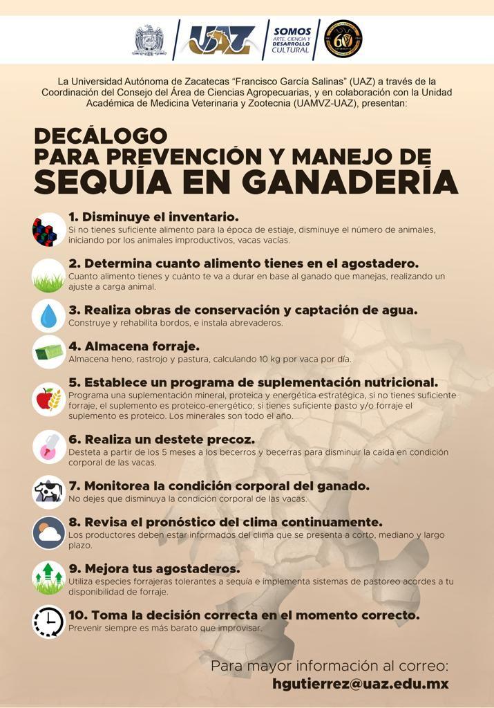 El coordinador del consejo del área agropecuaria aseguró que la Universidad Autónoma de Zacatecas se desarrolló el “Decálogo para Prevención y Manejo de Sequía en Ganadería”.