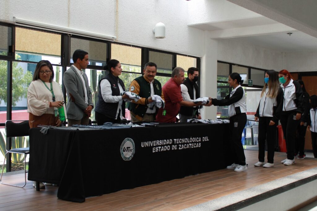 Rosa Esther Ortiz, subdirectora de atención a grupos vulnerables del SEDIF; Antonio Romero, representante del INCUFIDEZ; Juan Claudio Esparza, representante de la Secretaria de Educación, Maribel Villalpando, y el rector de la UTZAC, entregaron los uniformes correspondientes de las diferentes diciplinas a todos los alumnos que acudirán a la ciudad de Saltillo, Coahuila.