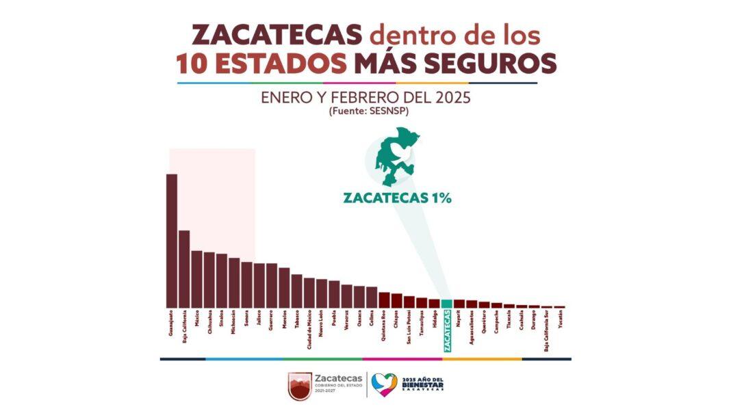 De acuerdo con los datos del Secretariado Ejecutivo del Sistema Nacional de Seguridad Pública (SESNSP) presentadas esta mañana, durante enero y febrero de 2025 en Zacatecas se registraron 44 homicidios dolosos, es decir el 1 por ciento a nivel nacional. Dicha cifra está muy por debajo del promedio nacional, que es de 139.7 homicidios dolosos.