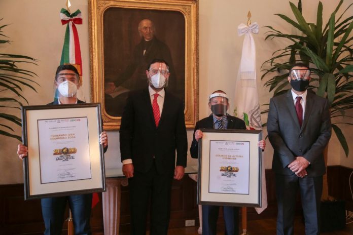 Zacatecas, Zac.- El Gobernador Alejandro Tello otorgó sendos reconocimientos a los ganadores del Premio Estatal del Deporte Zacatecas 2020, Fernando Iván Rodríguez Sosa, como deportista, y Gerardo de la Torre Rodríguez, como entrenador.
