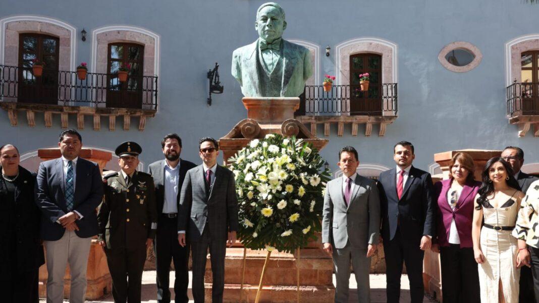 Durante la ceremonia cívica por el 219 aniversario del Natalicio del Benemérito de las Américas, Benito Juárez García, en representación del Gobernador David Monreal Ávila, el Secretario General de Gobierno, Rodrigo Reyes Mugüerza, destacó que, desde el inicio de la actual administración, Zacatecas vive una transformación profunda en los 58 municipios para avanzar a la pacificación y el bienestar social.
