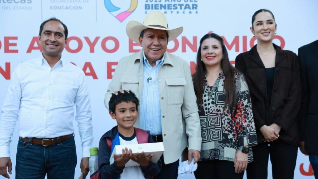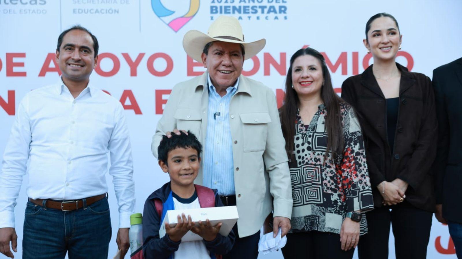 “Vengo a refrendar mi compromiso con la educación y con las personas de Guadalupe y de todo Zacatecas; con este programa, ayudamos de manera importante en la economía de las familias, expresó el Gobernador David Monreal en compañía de la Secretaria de Desarrollo Social, Bennelly Hernández Ruedas, que opera este programa; de la Secretaria de Educación, Gabriela Pinedo Morales.