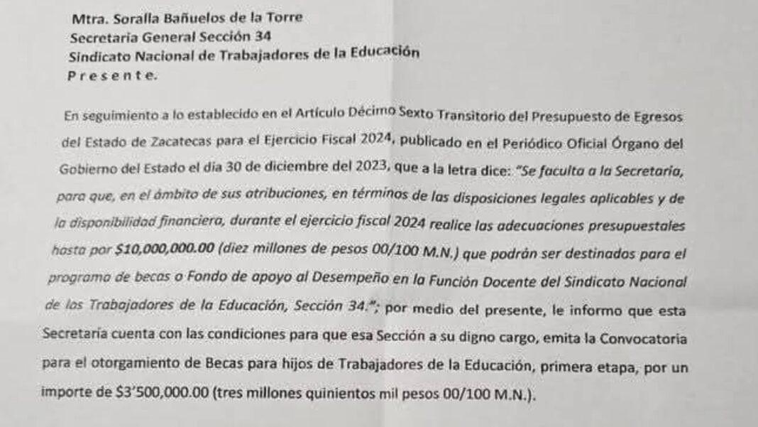 El Secretario General de Gobierno, Rodrigo Reyes Mugüerza, dijo que para el año 2025 el presupuesto contempla hasta 6 millones de pesos para apoyos educativos dirigidos a los sindicatos del sector educativo, aunque 2 millones de ese monto ya fueron solicitados por otra sección sindical.