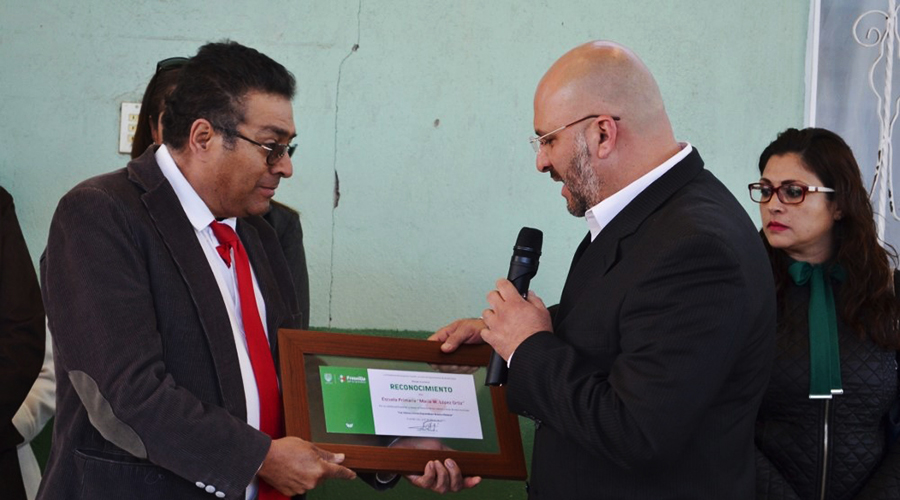 Ramírez Díaz, hizo entrega de un reconocimiento al director del plantel, Pascual Martín Gómez Sandoval, por honrar los Símbolos Patrios.