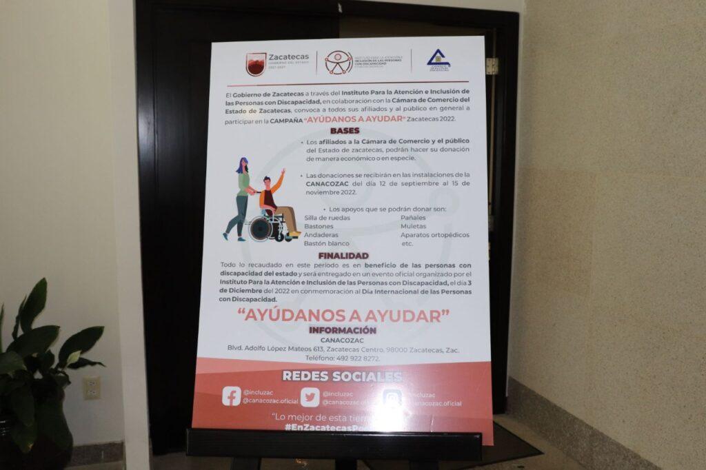 Zacatecas, Zac., 12 de septiembre de 2022. El Gobierno de Zacatecas, a través del Instituto para la Atención e Inclusión de las Personas con Discapacidad, y en colaboración con la Cámara Nacional de Comercio de Zacatecas (Canacozac), presentó la Convocatoria “Ayúdanos a Ayudar”.