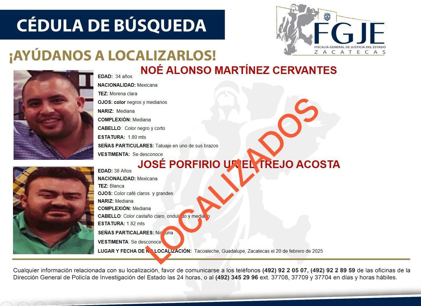 La Fiscalía General de Justicia del Estado de Zacatecas anunció la mañana de este martes la localización de Noe Martínez Cervantes y Porfirio Trejo Acosta.