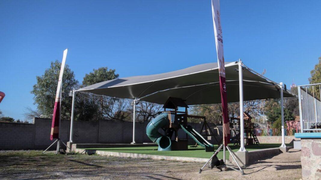 Esta importante obra consiste en la colocación de 102 metros cuadrados de cubierta para techumbre tipo velaría, 200 metros cuadrados de suministro y colocación de pasto sintético de 15 milímetros, 6 piezas de reflector solar de 200 watts con panel solar y 2 bancas de perfil tubular, en conjunto con el programa federal La Escuela Es Nuestra (LEEN).