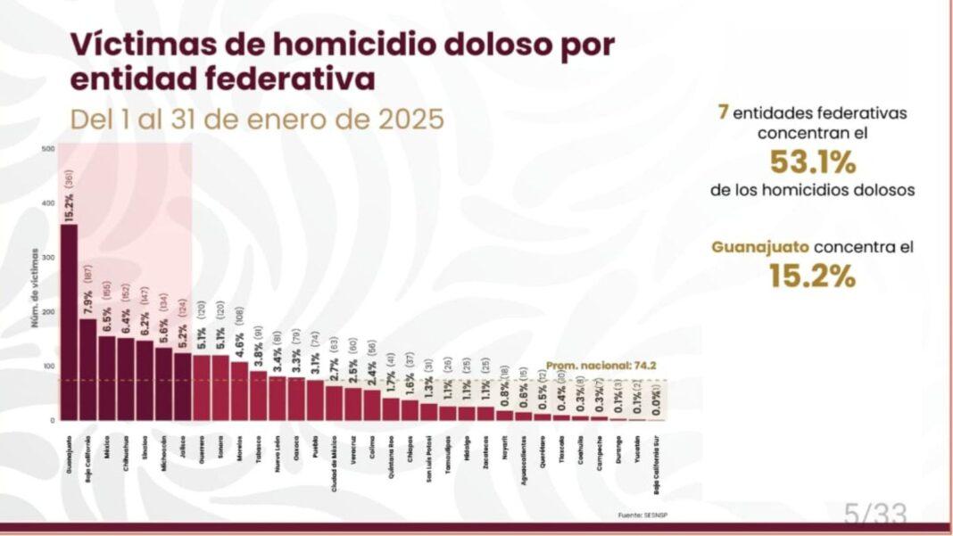 Este martes, en Palacio Nacional, la secretaria ejecutiva del Sistema Nacional de Seguridad Pública (SNSP), Marcela Figueroa Franco, dio a conocer las cifras de la incidencia delictiva en el país. Resultado de ello, destaca que en Zacatecas se registraron 25 homicidios durante el primer mes de 2025, lo que representa el 1.1 por ciento del total de asesinatos ocurridos en México en ese lapso.